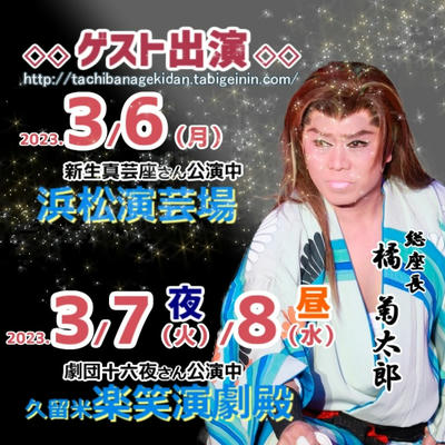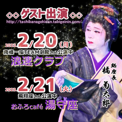 2/20・ 2/21 総座長 ゲスト出演 2023年02月15日 2023年02月 0 2月20日(月)浪速クラブ2月21日(火)おふろcafé 湯守座 橘菊太郎 ゲスト出演致します。https://sakua0902iv.blog.shinobi.jp/Entry/1958/ [0回]