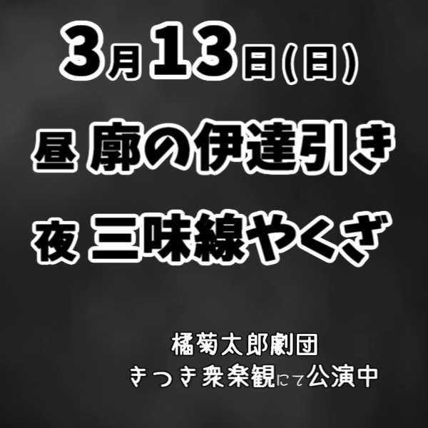 3月13日(日)演目 2022年03月07日 明日の演目 0 3月13日(日)昼夜公演昼「廓の伊達引き」夜復活狂言「三味線やくざ」藤ひろし座長、ゲスト出演 https://sakua0902iv.blog.shinobi.jp/Entry/1838/ [0回]