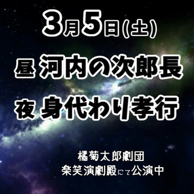 3月5日(土)演目 2022年03月03日 明日の演目 0 3月5日(土)昼夜公演「河内の次郎長」夜「身代わり孝行」(昼夜)橘佑乃介座長、ゲスト出演 https://sakua0902iv.blog.shinobi.jp/Entry/1824/ [0回]