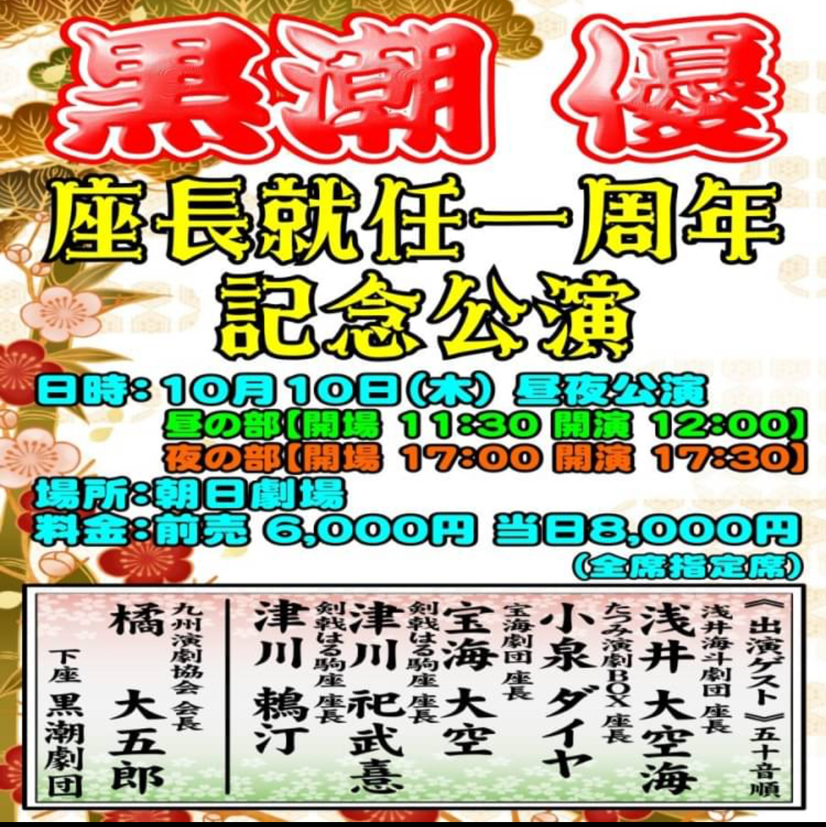 10/10(木) 黒潮 優 座長就任一周年記念公演 橘 大五郎 2024年09月22日 2024年10月 0 10月10日(木)朝日劇場黒潮 優 座長就任一周年記念公演橘 大五郎 出演致します。 [0回]