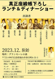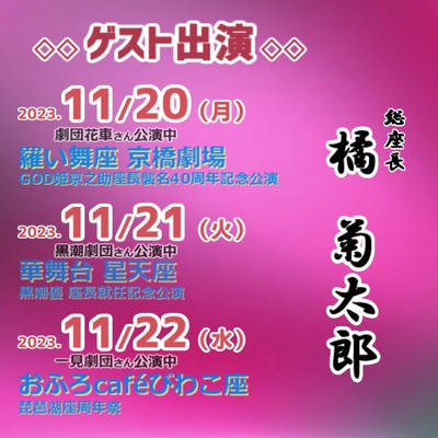 2024年02/20(火) 飯塚セントラル劇場 6周年記念座長大会 2023年11月18日 2024年02月 0 2024年02月20日(火)飯塚セントラル劇場6周年記念座長大会■ご予約開始■2023年11月10日から飯塚セントラル劇場■下座■橘菊太郎劇団詳細は後日発表 [0回]