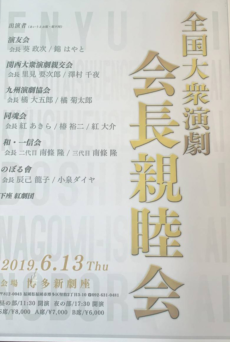 6/13 全国大衆演劇 会長親睦会 2019年05月22日 2019年06月 0 6月13日(木)全国大衆演劇 会長親睦会 http://sakua0902iv.blog.shinobi.jp/Entry/1343/ [0回]