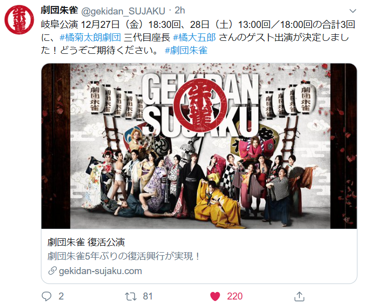 12/27 劇団朱雀復活興行「岐阜公演」三代目、出演決定 2019年12月08日 2019年12月 0 12/27 劇団朱雀復活興行「岐阜公演」橘大五郎、出演決定!!http://sakua0902iv.blog.shinobi.jp/Entry/1449/ [0回]