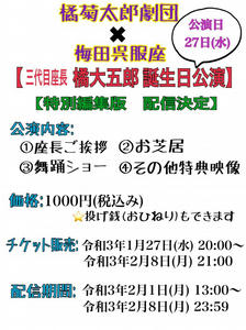 『三代目座長・橘大五郎 誕生日公演』特別配信 2021年01月28日 2021年01月 0 橘菊太郎劇団×梅田呉服座『三代目座長・橘大五郎 誕生日公演』特別配信!! / https://sakua0902iv.blog.shinobi.jp/Entry/1643/ [0回]