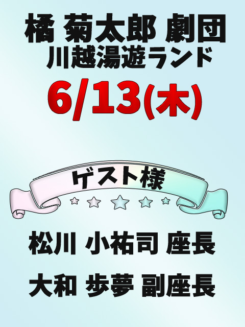 6月公演『橘劇団』 ファンの集い開催決定15日、夜の部終了後 お申込み方法:2階フロントにて お申込み締切:当日18:00まで 参加費:大人3,500円 :子供1,000円 ご来館お待ちしております。 #橘劇団 #橘大五郎#ファンの集い #川越湯遊ランド #小江戸座 pic.twitter.com/NitdZtmj5Q