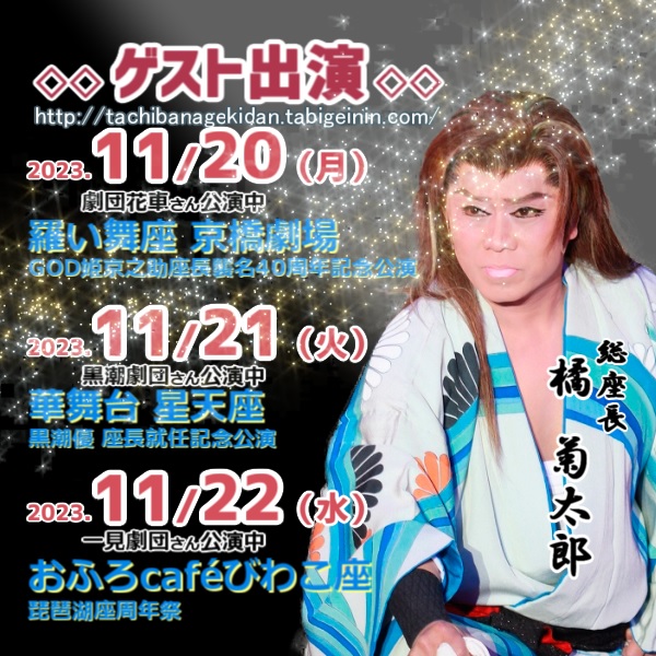 11/20~総座長 ゲスト情報 2023年11月07日 2023年11月 0 11月20日(月)GOD姫京之助座長襲名40周年記念公演6000円11月21日(火)黒潮優座長就任記念公演10000円11月22日(水)琵琶湖座周年祭1568円(平日通常料金) [0回]