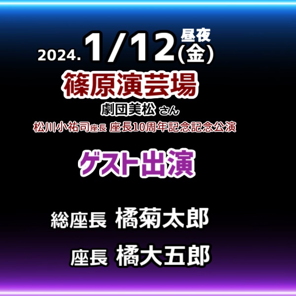 2024.1/12 松川小祐司 座長 座長10周年記念公演 2023年12月11日 2024年01月 0 1月12日(金)松川小祐司 座長 座長10周年記念公演橘菊太郎橘大五郎出演いたしますhttps://sakua0902iv.blog.shinobi.jp/Entry/2042/ [0回]